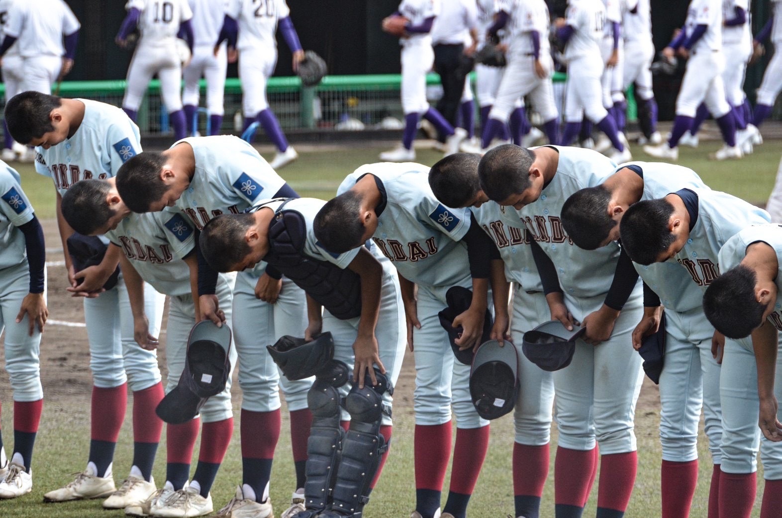 なんとか反撃したい本校は先頭の岩屋が今日4本目のヒットで出塁するなど、2死2塁のチャンスを迎えます。5番の宮本は今日2つ目の申告敬遠で歩かされ2死1,2塁。ここで打席に入ったのは6番門司。スリーツーからの高めの直球にバットが空を切り三振。本校が5-8で優勝候補の東福岡高校に敗れました。