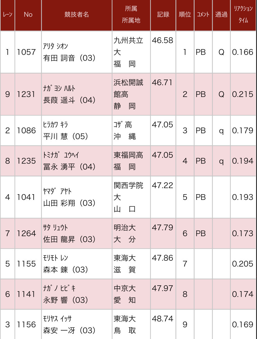 また、昨年度に藤原先生(3の5)のクラスだった卒業生の有田詞音(金川中出身)が、U20男子400mに出場し、全体のトップ通過(大会新記録まで0.04秒)で決勝進出を果たしております!