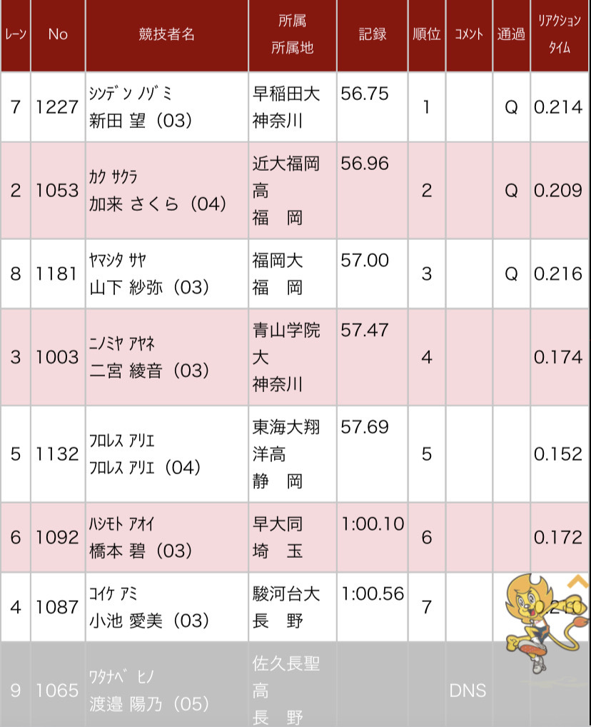 本校から3年7組 加来さくら(志免東)が、U20女子400mに出場していますが、大学生と堂々と戦い、見事決勝進出を果たしましたので報告致します!
