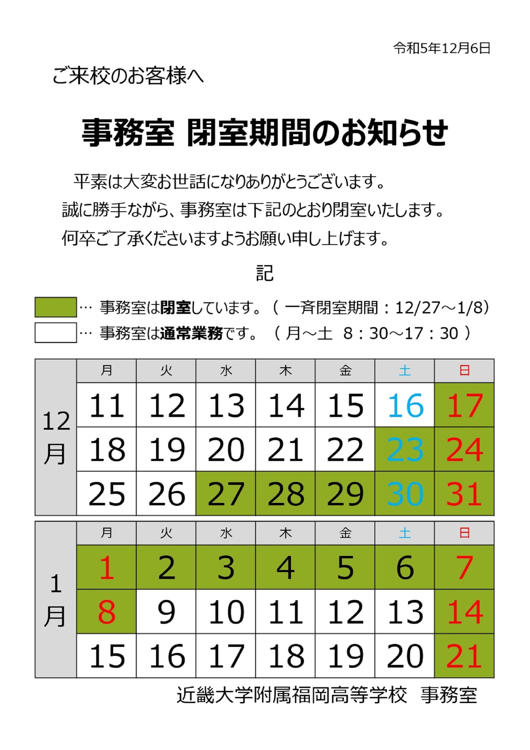 【事務室閉室期間】